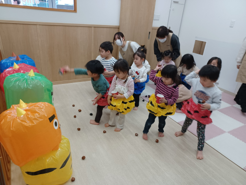 豆まきをしました⭐️ 今日は節分なので 保育園でも豆まきをしました。 泣き虫鬼、おこりんぼ鬼、 いたずら鬼、ニコニコ鬼に向かって 『鬼は外ー!福は内ー!』と言いながら 豆を投げました。 そこへ鬼が登場!! みんな初めはびっくりしてお部屋の後ろに 隠れたり先生のところに行っていましたが 鬼に向かって豆を投げていました❗ みんなの力で鬼を追い払うことが できました😊 2026年02月03日 02:13 スタッフ